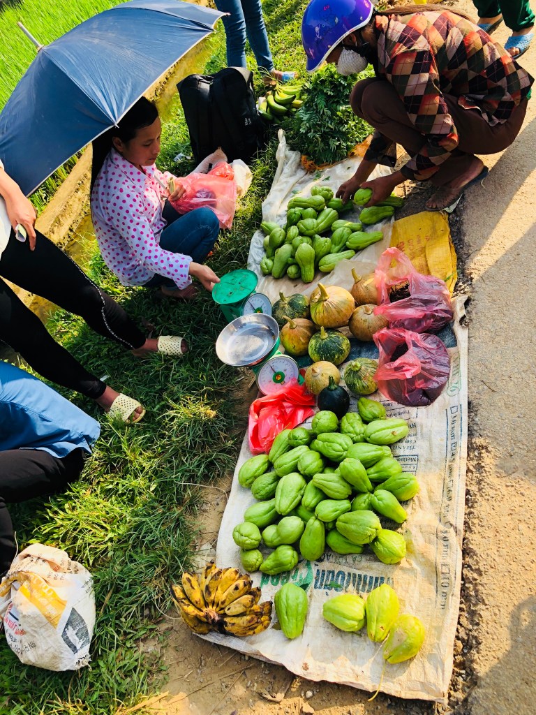 Cả đám đi chợ người dân tộc tổ chức chỉ thứ 5 & chủ nhật hàng tuần. Người mang con heo con con, người mang con gà, con cá, vài lọn rau, mấy bịt thuốc nam. Trao đổi nụ cười. Lâu lâu cũng coá sạp đồ Trung Quốc, hai mươi ngàn một bộ đồ ngủ…