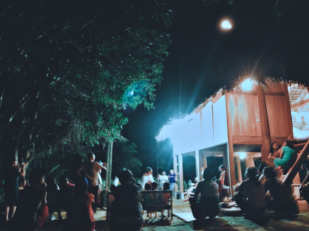 Cả bản kéo lại, đua tài. Mấy đứa con gái, mặc đồng phục, nhảy múa, hát mấy bài đồng dao của người Thái.