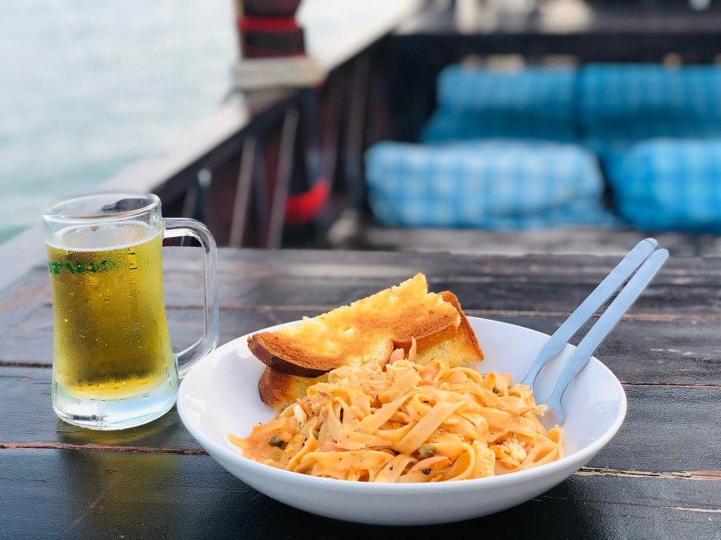 Về lại đất liền, Angelina chỉ một chổ ăn pizza gỗ và spagetti cực kì ngon, cách chổ ở 5 phút đi bộ. Trời thương, hôm đó cả khu được phép bán rụ bia!