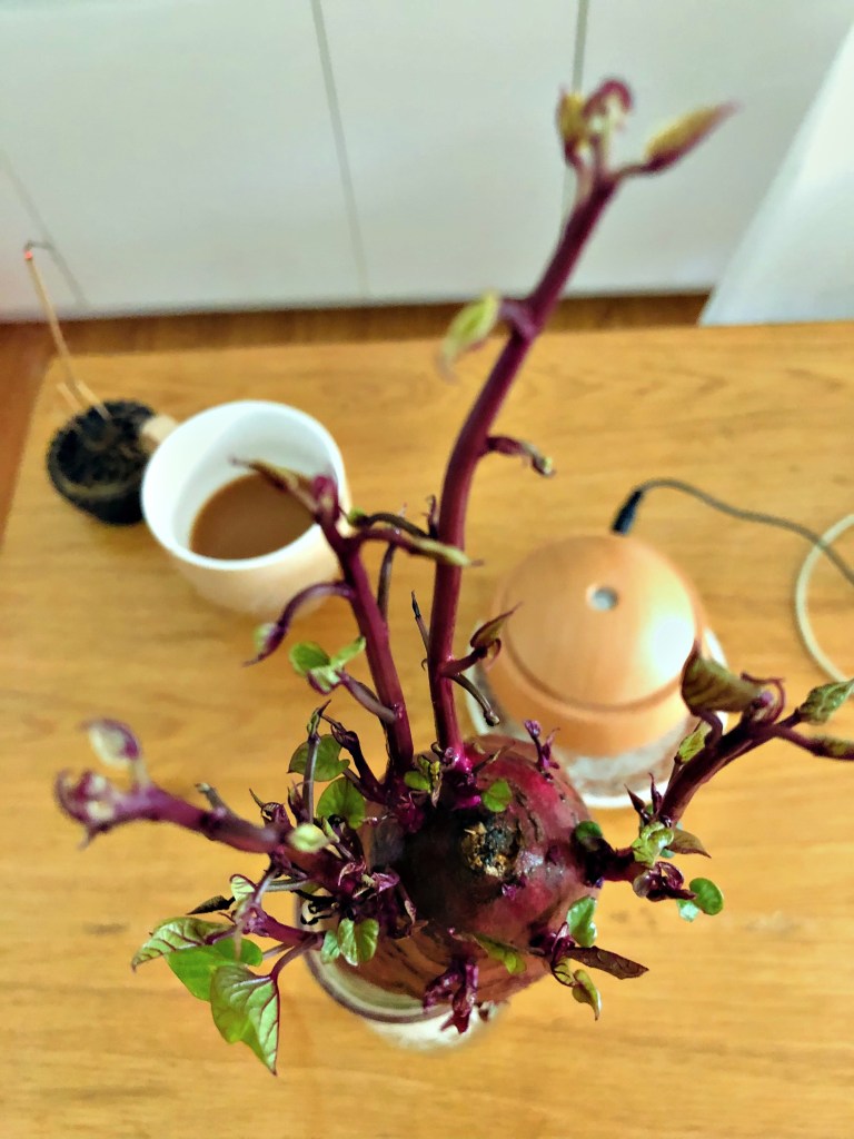 (2) Sáng nay, củ khoai lang đã ra rất nhiều rễ và cành. Ngắt bớt để dưỡng những cành to khoẻ thôi. Thay nước và đặt trên bàn. Đốt chút tinh dầu sả, ngắm từng lá non. Nghe một bài Mantra ca ngợi thần Ganesha (Om Gam Ganapataye Namaha).