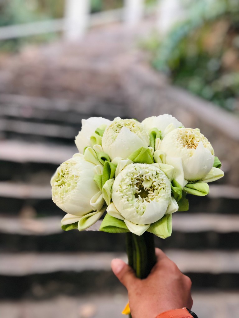 Chỉ hiền hoà, mỉm cười chìa tay đưa mình 1 bó sen đẹp nhất (mình thấy vậy).
