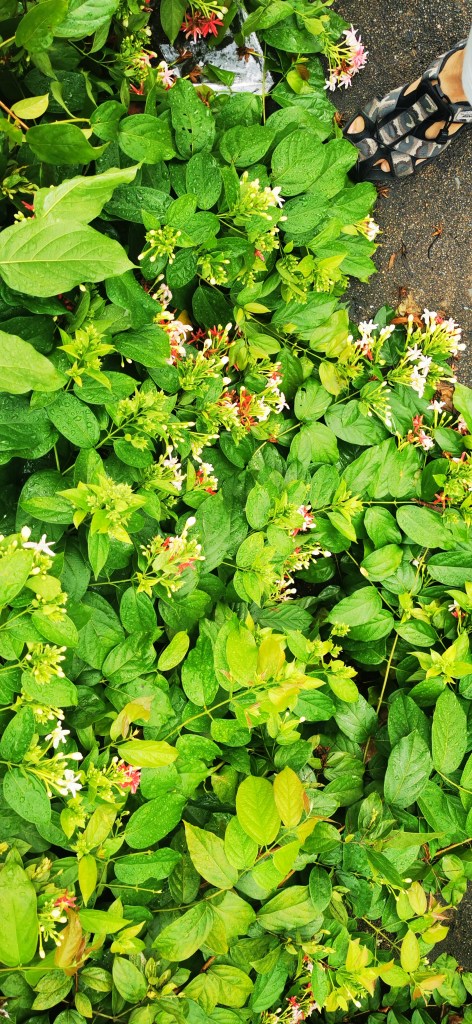 Bước qua cầu, luôn nhớ bên trái là giàn hoa sử quân tử đàng mùa trổ bông. Nó quấn đầy lên cột điện, rồi vô tư bò lên lan can cầu, bám bất chấp vào mọi chổ. Đi tới đâu, bọn hoa chen nhau nở tới đó. Đúng là quan tử mà, không biết thẹn, cưng ghê.