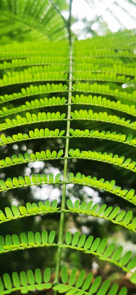 Phượng vĩ mùa này đã ra mùa lá non mới. Xanh mướt mắt. Có bao giờ bạn đếm một tàu có bao nhiêu lá phượng con không. Bạn có bao giờ để ý cách sắp xếp lá của nó khum?