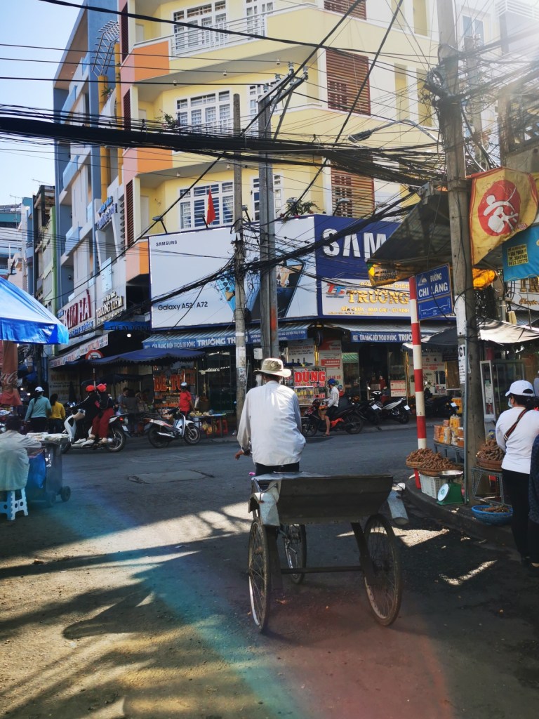 Lễ xong, lững thững xách tui ra ngoài lộ. Lang thang gặp một chú xe lôi đạp. Nhờ chú chở về khách sạn nằm trong trung tâm thành phố.