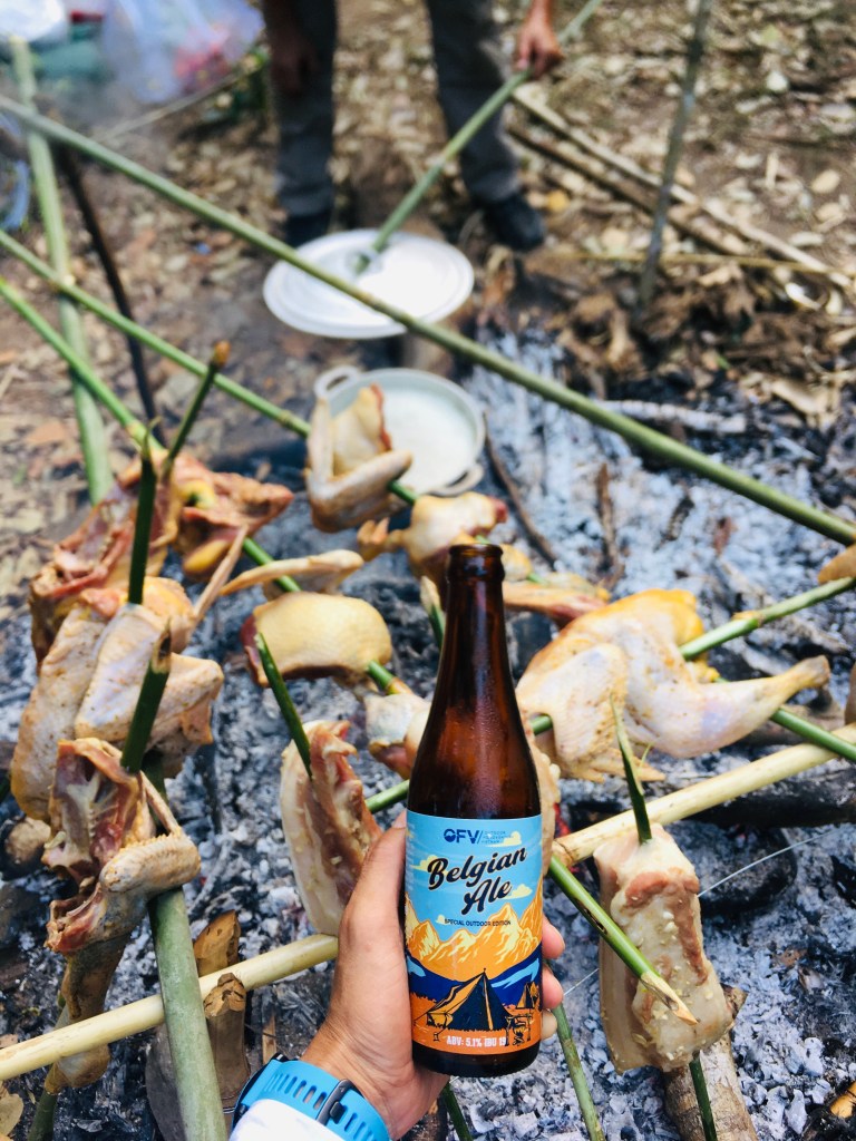 Chiều xuống khá nhanh. Chưa chi màn đêm đã bao trùm khắp bãi. Những ngọn lửa bùng, kèm theo tiếng tí tách của mấy ống cơm lam, thơm phức. A Giang đích thân nấu mấy món ăn vùng núi, làm một loại nước chấm thần thánh. Bia cũng ướp sẵn sàng chờ mọi người lai rai.