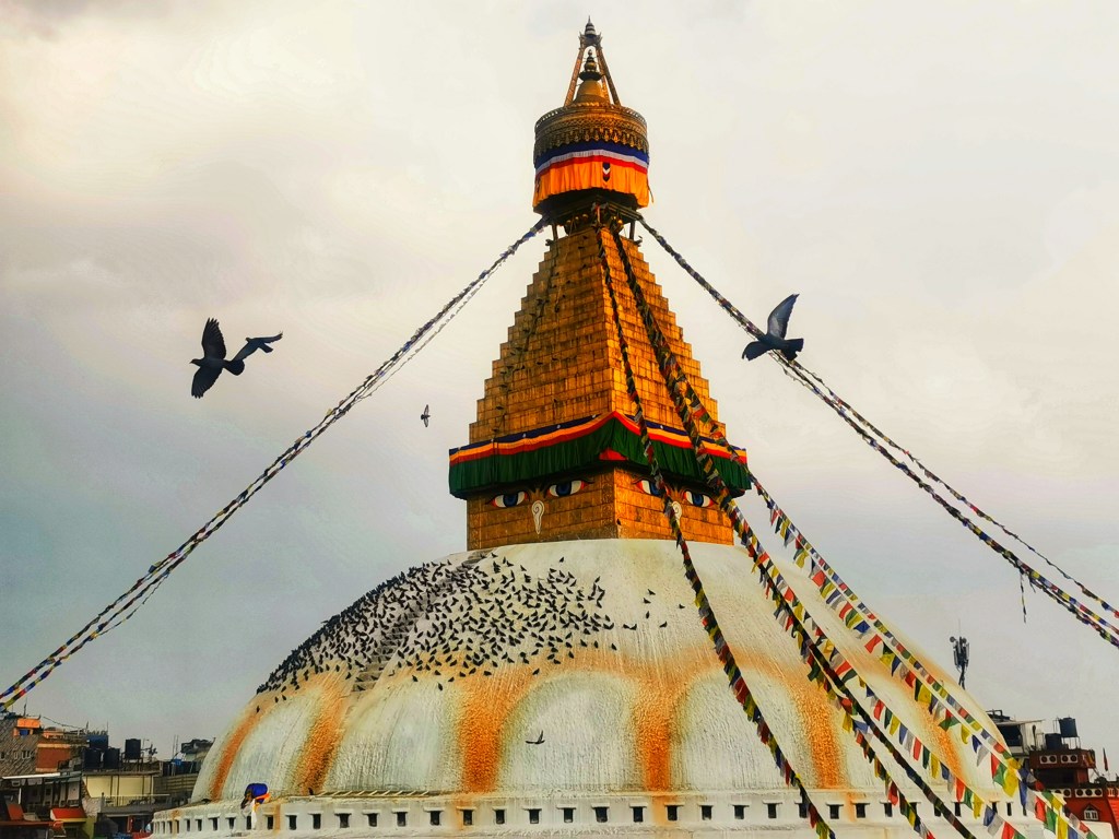 Boudhanath với bảo tháp lớn nhất thế giới chào đón ngày trở lại với một chiều nắng vàng ươm. Đi một vòng Stupa theo hướng quay của kim đồng hồ thấy lòng nhẹ tênh.