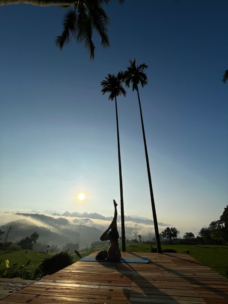 Cảm giác muốn cả núi rừng Pù Luông! Nắng đã lên sau cánh rừng. Mang vội tấm thảm yoga, đặt ngay ngắn vào chỗ cái sàn gỗ, vươn vai, hít vào thở ra nhẹ nhàng nhất có thể. Tận hường từng cái hít vào, thở ra trên từng bước chân trên thảm. Hít vào, tâm tĩnh lặng, thở ra, miệng mỉm cười. An trú trong hiện tại. Phút giây, đẹp tuyệt vời…. Om shanti, shanti, shanti!Cảm nhận từng giọt sương đọng trên lá mạ, cái lấp lánh của ánh nắng chiếu qua từng kẽ lá.