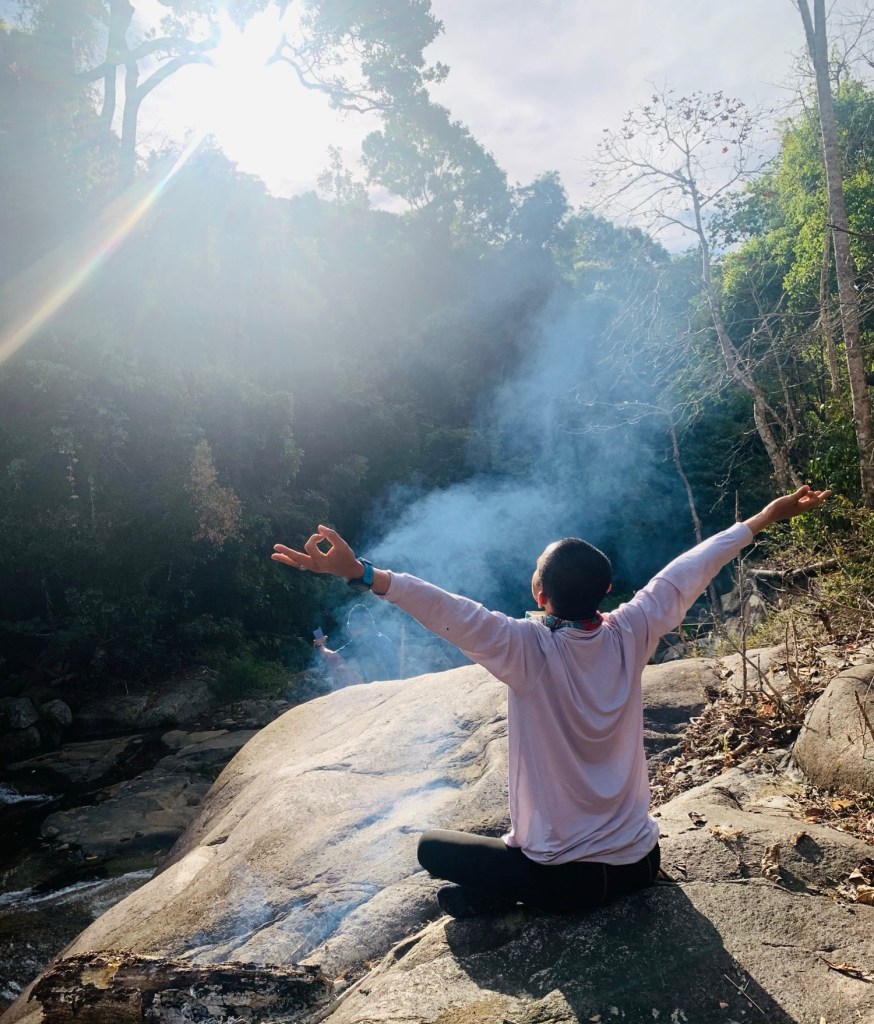 Sáng hôm sau, không khí yên bình đến lạ thường. Lúc 6:00 sáng, tôi lòm còm bò ra khỏi lều, đánh răng, rửa mặt và tìm một góc yên tĩnh bên bờ suối để tập yoga. Nhìn qua bờ bên kia, vài “con chim sớm” cũng đang thảnh thơi pha cà phê pour-over tận hưởng cuộc sống đầy oxy trong rừng.