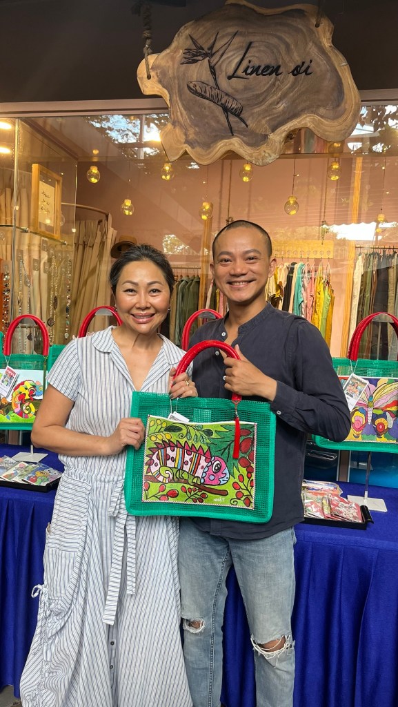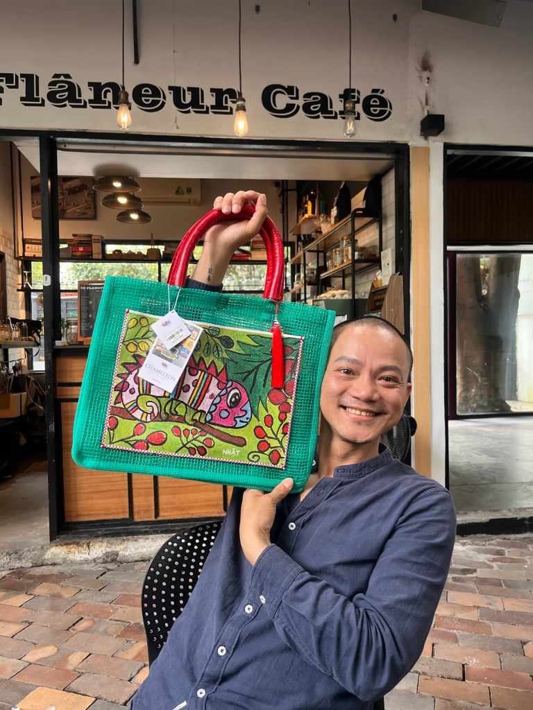Trước khi rời đi, mình mua ủng hộ một chiếc túi. Làm từ lưới đánh cá. Mặt trước in tranh vẽ tay của một bạn nhỏ tự kỷ tên Nhật. Một con tắc kè đầy màu sắc. Nét vẽ sinh động, bố cục có cảm giác rất riêng.