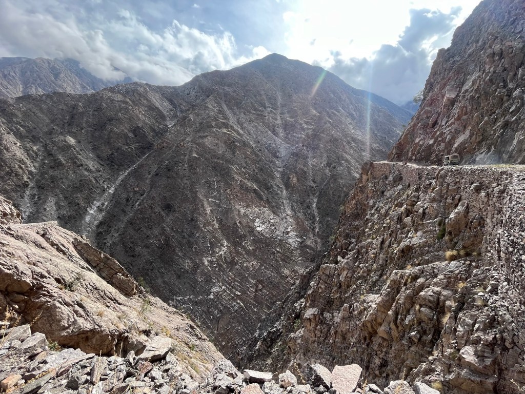 Tại Raikot Bridge, một cây cầu kim loại bắc ngang dòng Indus, chúng tôi đổi sang chiếc jeep cũ kỹ. Con đường hẹp, một bên là vách núi dựng đứng, một bên là vực sâu.