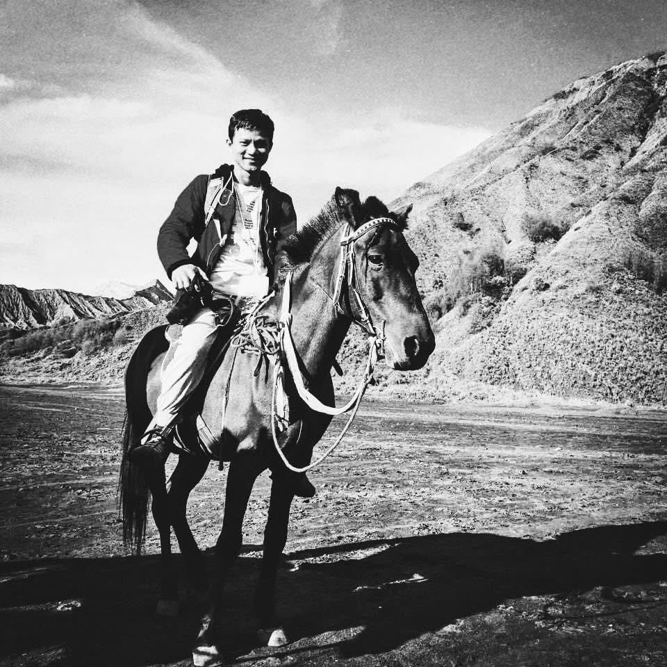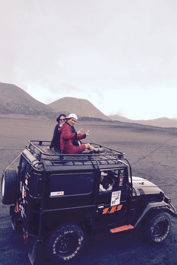Bromo thênh thang và đen đúa. Jeep băng qua biển cát. Thuý với tôi leo lên nóc xe ngồi, gió rít, ổ gà nảy người, chỉ còn biết cười. Vòng qua chân núi, mỗi người cưỡi một con ngựa men theo sườn dốc.