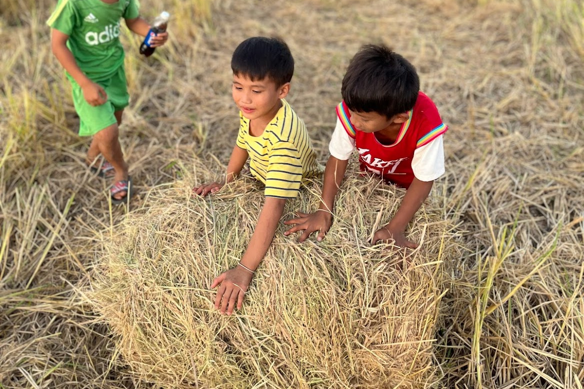Tới trưa, đồng sáng rực như ai đổ mật xuống. Trên bờ, bầy con nít chạy chân trần, nhảy từ đống rơm này qua đống rơm kia, cười khanh khách nghe muốn cười theo. Ở Tiền Giang, tụi nhỏ khoái leo lên ghe chở lúa, vừa đong đưa chân vừa hít no một hơi mùi nắng, mùi lúa mới. Còn ở Lumbini bên Nepal, tụi nhỏ cũng chạy chơi giữa đồng, lâu lâu ngoái lại nhìn về phía tu viện, nơi mấy vị sư khoác áo đỏ sẫm đi ngang, bóng áo nổi bật giữa màu lúa xanh mướt như tấm thảm trải dài tới tận chân trời.
