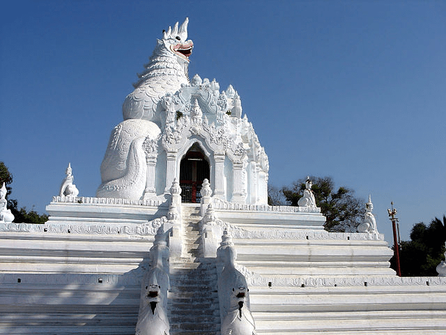 Myanmar favors large masses, finished in white lime. Gate guardians give a feeling of steadiness. From the courtyard looking up to the stupa, the eye follows the body of the figure and comes to rest at the top of the zedi (in Burmese, “stupa” or “pagoda”), where the idea of awakening is set in balance.