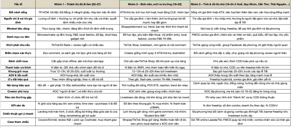 Tạm thời tách họ thành 3 nhóm dễ dùng cho cả team chiến lược, team nội dung và team media.