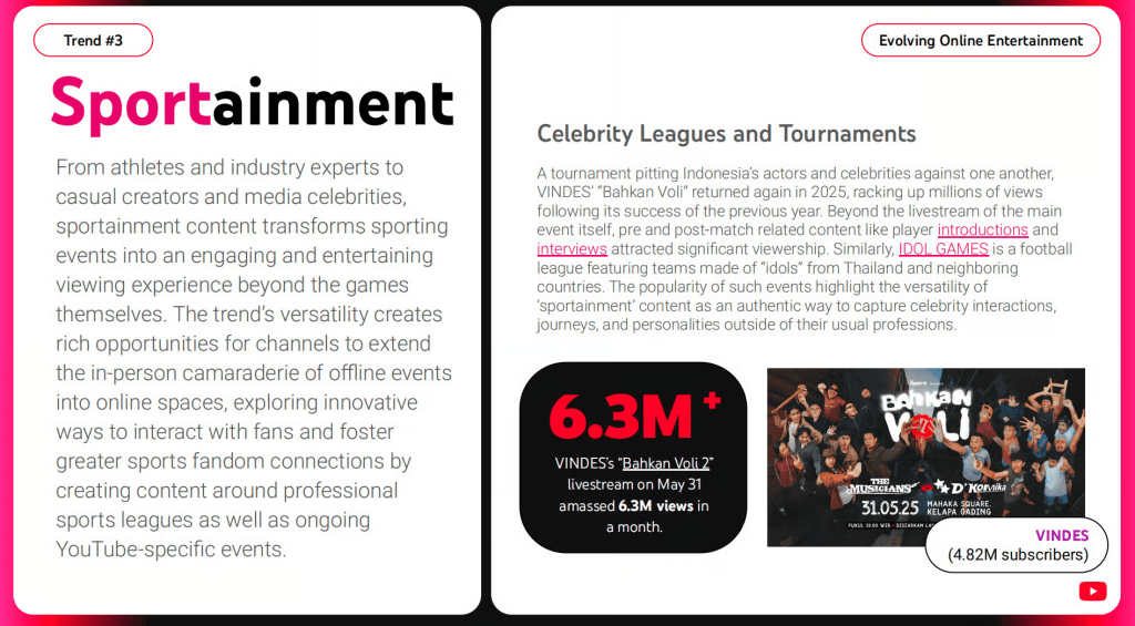 Một nhánh khác đang tăng tốc là sportainment, nơi thể thao được kéo ra khỏi “trận đấu” để thành một vũ trụ nội dung. VINDES livestream “Bahkan Voli 2” đạt 6.3 triệu views trong một tháng, và phần hấp dẫn không chỉ ở main event mà còn ở lớp nội dung trước và sau trận: giới thiệu nhân vật, hậu trường, phỏng vấn, tương tác live chat.