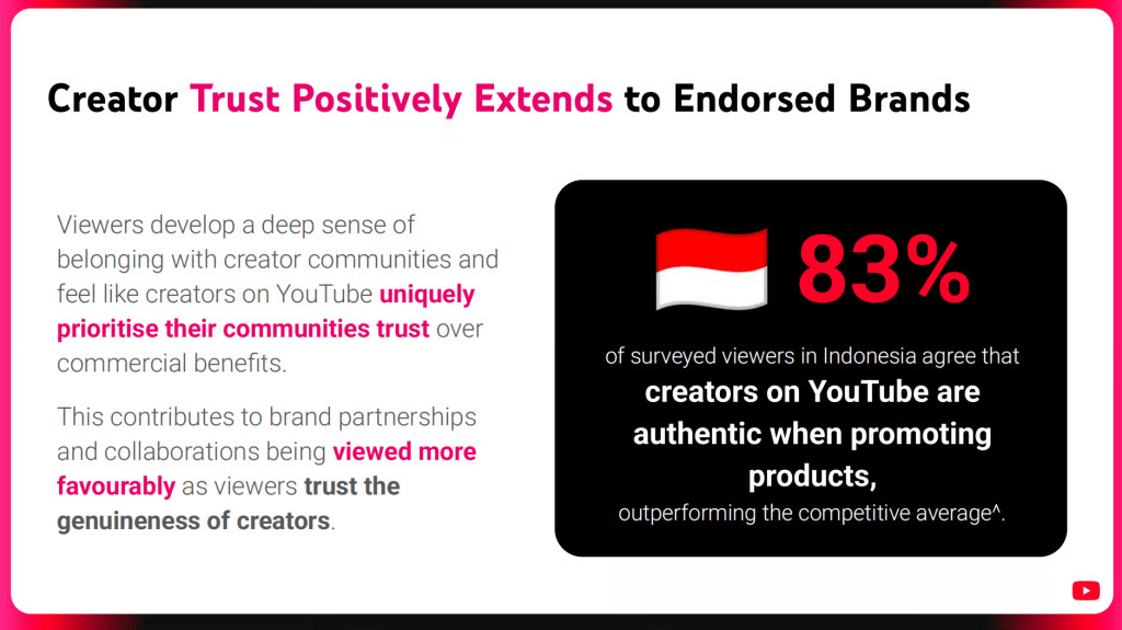 Tất cả các mảng này hội tụ về một chữ: TRUST. Khi người xem tin creator và tin môi trường nội dung, brand partnership bớt bị nhìn như “quảng cáo” và gần hơn với “một phần hợp lý của câu chuyện”. Báo cáo ghi nhận 83% người được khảo sát ở Indonesia đồng ý creator trên YouTube “authentic khi promote sản phẩm”, và 86% nói họ tin quan điểm về brand và sản phẩm từ creator trên YouTube. Với planning, trust không phải một dòng trong brand key. Nó là điều kiện để nội dung được xem tiếp, được chia sẻ, và được chuyển hóa thành hành vi.