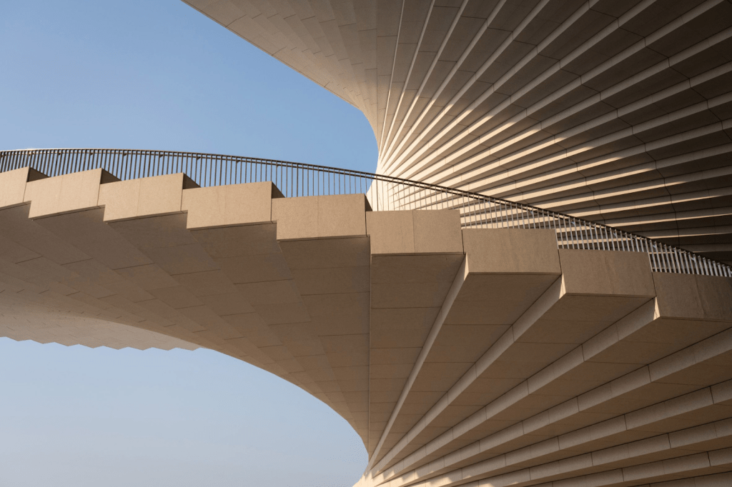 Rời khỏi sự tĩnh mịch của Nhật Bản, cảm xúc của chúng ta được nhấc bổng lên bầu trời với sự hùng vĩ tại Nhà hát Lớn Thượng Hải (The Shanghai Grand Opera House) qua bàn tay của Snøhetta. Nếu Ando đưa ta vào lòng đất để tìm sự an yên, thì Snøhetta lại mời gọi ta khiêu vũ với gió trời. Cầu thang ở đây không nằm trong nhà, nó chính là mái nhà. Một cấu trúc xoắn ốc khổng lồ bằng bê tông uốn lượn mượt mà như chiếc quạt giấy đang mở ra, hay như vạt áo của một vũ công đang xoay tròn giữa đô thị phồn hoa. Những bậc thang nan quạt dẫn du khách từ mặt đất đi bộ lên tận đỉnh, xóa nhòa ranh giới giữa tòa nhà và cảnh quan, biến mỗi bước chân lên cao thành một lần mở rộng tầm mắt đón gió sông.