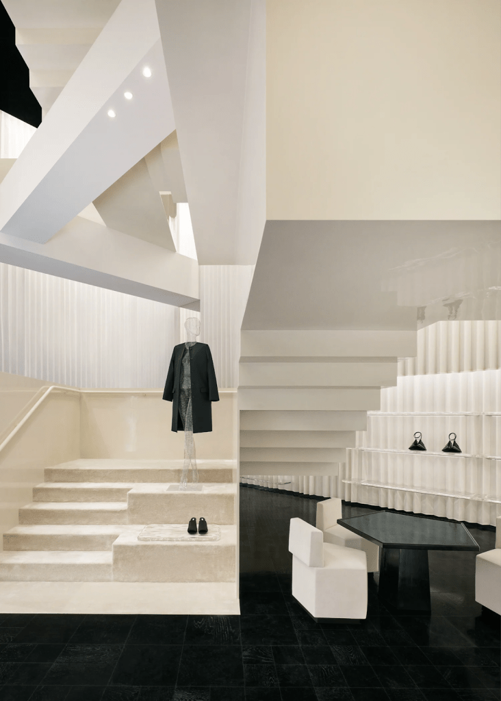 Trong khi đó, ở một không gian mang tính riêng tư hơn tại Bắc Kinh, hai bậc thầy người Thụy Sĩ Herzog & de Meuron lại mang đến định nghĩa về sự sang trọng và tối giản lạnh lùng. Tại cửa hàng flagship Toteme, họ không dùng bê tông thô ráp hay gỗ mộc, mà chọn thép sơn mài. Cầu thang zigzag luồn lách qua không gian nội thất đơn sắc như một tia chớp đen sắc sảo. Vẻ đẹp của nó nằm ở sự chính xác đến nghẹt thở, gợi nhớ đến những đường cắt may dứt khoát trong thời trang cao cấp. Bước đi trên đó, ta nghe thấy tiếng vọng của nhịp sống đô thị gấp gáp, hiện đại nhưng đầy phong cách.