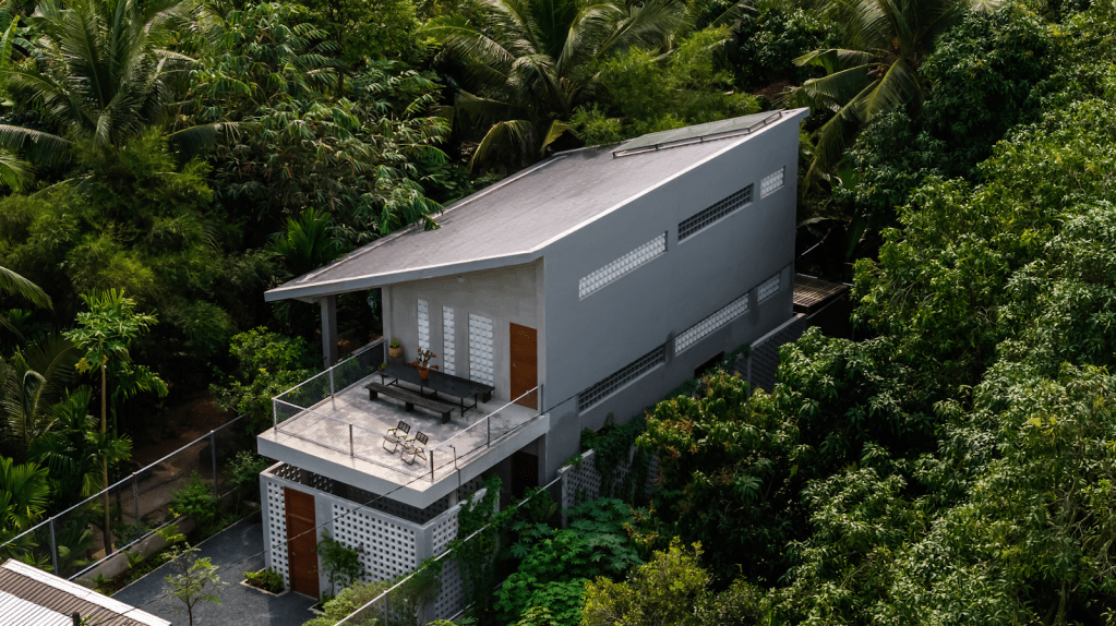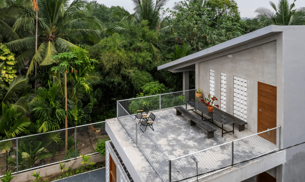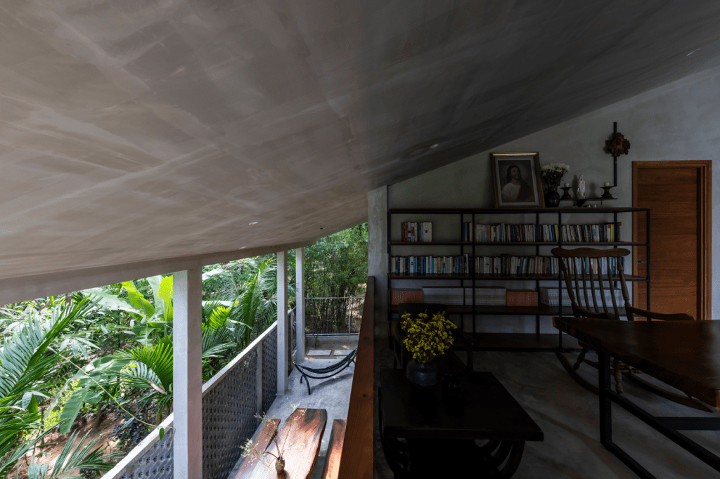 Người ta thường nghĩ bê tông là thứ vật liệu lạnh lùng, vô tri. Nhưng ở đây, dưới bàn tay của MM++ Architects, những khối bê tông thô mộc bỗng trở nên dịu dàng đến lạ. Chúng sần sùi, chân thật, đứng đó vững chãi như một bờ vai để người nghệ sĩ tựa vào. Mái nhà vươn rộng, trầm mặc như một đôi cánh lớn, sẵn sàng dang ra che chở cho con người trước cái nắng gắt gao hay những cơn mưa rừng xối xả. Dưới mái hiên ấy, ranh giới giữa trong và ngoài bị xóa nhòa, chỉ còn lại ta và tiếng mưa rơi lộp độp, tiếng lá thở xào xạc.