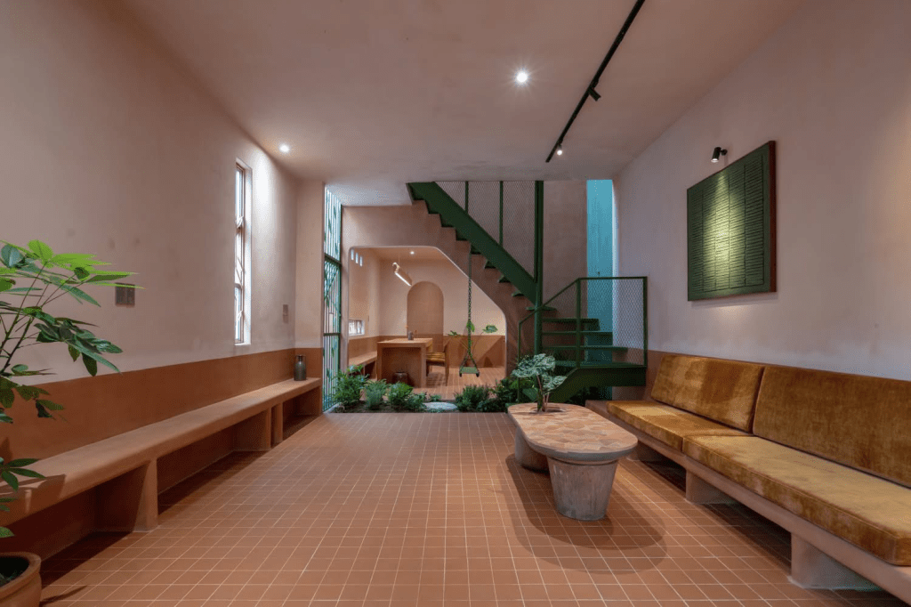 Đây là một dự án cải tạo nhà ống hẹp, hoàn thiện năm 2024, diện tích khu đất khoảng 70 m², nhưng tham vọng lại nằm ở xúc giác chứ không nằm ở quy mô. Ngôi nhà đưa gốm Lái Thiêu vào cả kiến trúc lẫn nội thất, để mỗi cái chạm vào tay nắm, mỗi bước chân trên nền nhà đều gợi lại một vùng đất. Hình khối được tổ chức như ba “khối chậu” liên kết, vừa đặc vừa mộc. Vật liệu được chọn có chủ ý để giữ cảm giác đất nung: gạch gốm, gỗ tái sử dụng, thép thô, và một lớp hoàn thiện tường mới từ đất sét bản địa pha thêm chất kết dính để bền hơn, phù hợp khí hậu. Cây xanh và ánh sáng được đưa vào như thể căn nhà mọc lên từ đất.