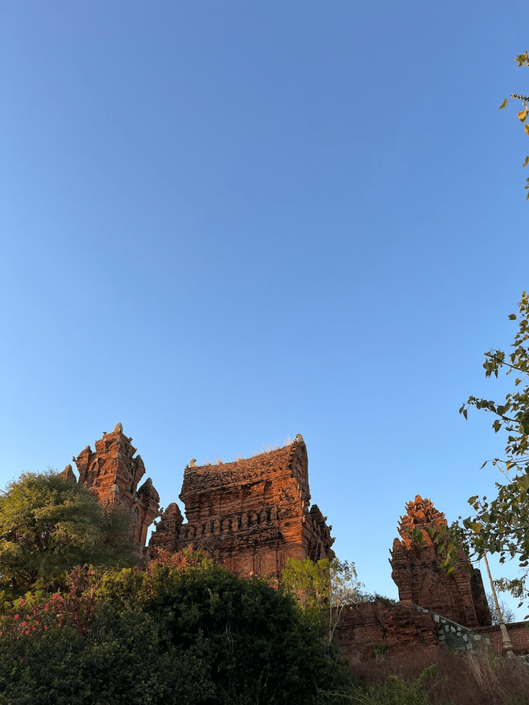 Trên đồi Trầu, cụm tháp Pô Klong Garai đứng như một mũi tên gạch đỏ cắm vào nắng. Tháp được xây dựng khoảng cuối thế kỷ XIII, đầu thế kỷ XIV để thờ vua Po Klong Garai. Điều khiến tôi bị giữ lại không chỉ là hình khối vươn cao, mà là cảm giác vật liệu đã “đi qua lửa” để trở thành ký ức.