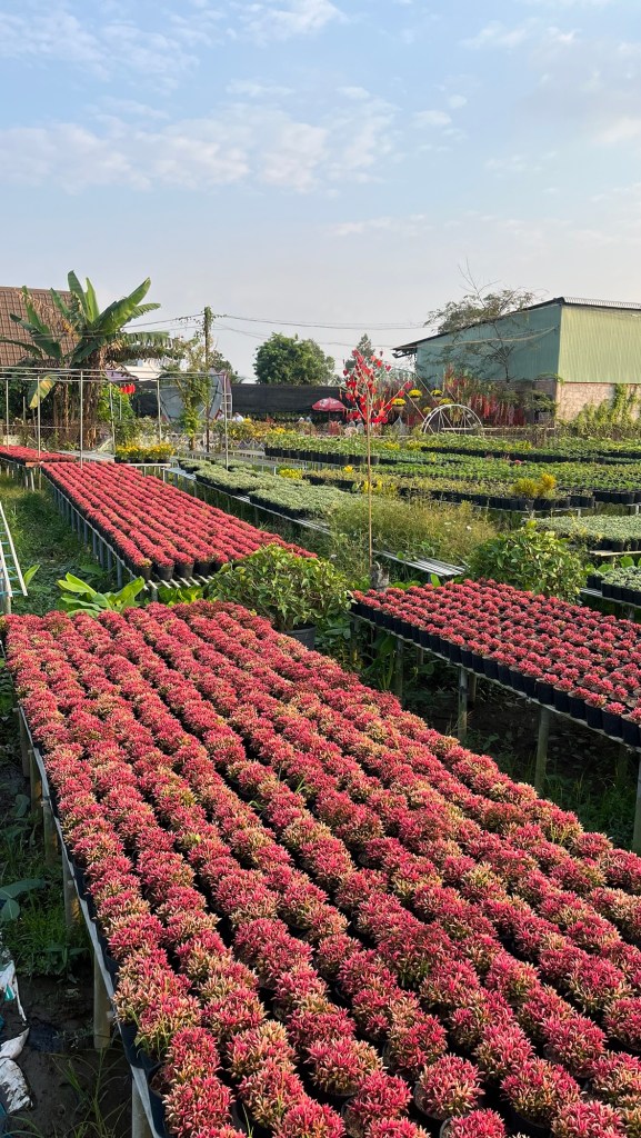Bước đi trên những con đường nhỏ len lỏi giữa làng hoa Tân Quy Đông, tôi thấy mình như đang trôi giữa hai bờ thực và mộng. Những luống cúc mâm xôi vàng rực, những giỏ hồng nhung thắm đỏ, hay đám cát tường mong manh… tất cả bỗng trở nên trầm mặc hơn dưới ánh chiều. Chúng không còn ganh đua sắc thắm với mặt trời ban trưa, mà nép mình vào sự tĩnh lặng của dòng nước.