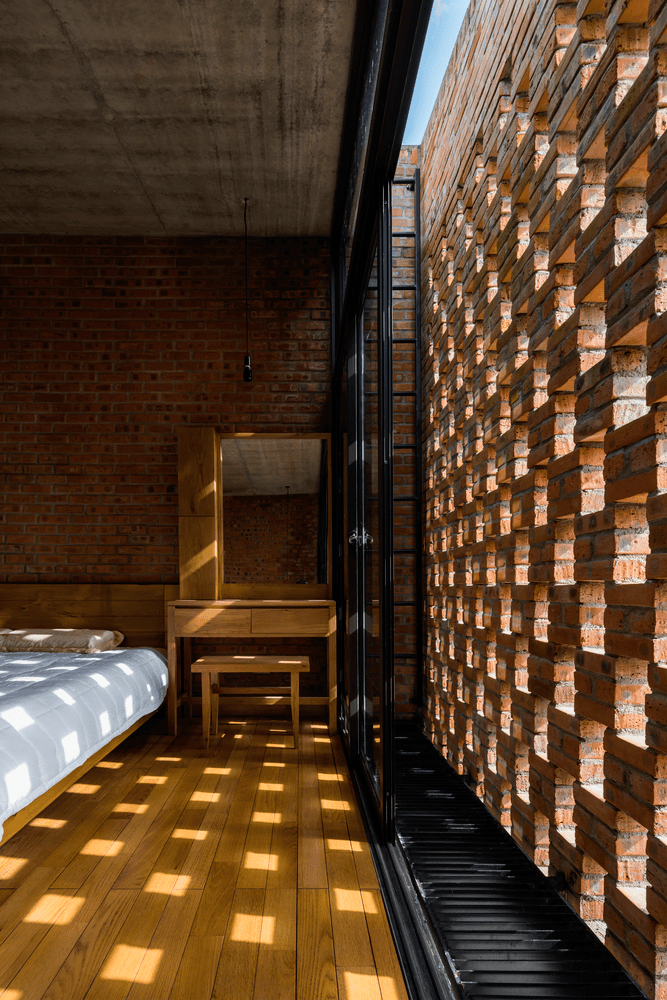 Tại những công trình như Cuckoo House hay các ngôi nhà gạch trần tại Long An, toàn bộ lớp vỏ được xây bằng gạch đất nung xếp so le, tạo nên hàng nghìn lỗ thở li ti. Đây là một tư duy vị nhân sinh đầy tinh tế: thay vì dùng bê tông để chặn đứng ánh nắng, người ta dùng đất nung để lọc nắng thành từng hạt bụi vàng rơi xuống sàn nhà. Gió sông mang hơi nước len lỏi qua những khe gạch, tự làm mát không gian bên trong một cách tự nhiên. Đất ở đây đóng vai trò là một bộ phổi thông minh, giúp con người thích ứng với tình trạng đô thị hóa nóng bức nhưng vẫn giữ được sợi dây liên kết với khí trời.