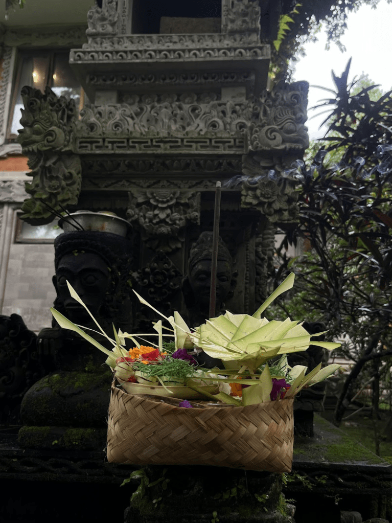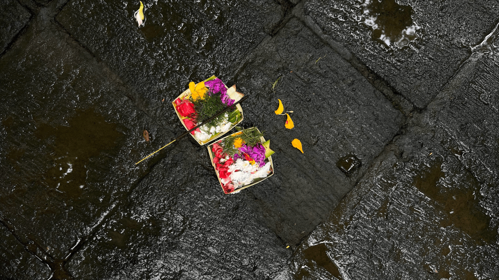 Sự cân bằng ấy không nằm trong những bộ kinh thư xa vời, mà hiển hiện rành rọt trong từng vi mạch của đời sống thường nhật. Mỗi sớm mai thức dậy, việc đầu tiên của người phụ nữ Bali không phải là lao vào guồng quay mưu sinh tất bật. Họ vận chiếc xà rông ngay ngắn, vấn lại mái tóc, thong thả tết những chiếc lá cọ non thành khay nhỏ, rồi cẩn trọng đặt vào đó vài cánh hoa tươi, chút cơm trắng và châm một nén nhang trầm. Khay lễ vật nhỏ bé ấy được đặt ở cửa nhà, trên bàn thờ gia tiên, nơi bệ đá ngã tư đường, hay thậm chí là trên nắp capo của một chiếc ô tô vừa nổ máy.