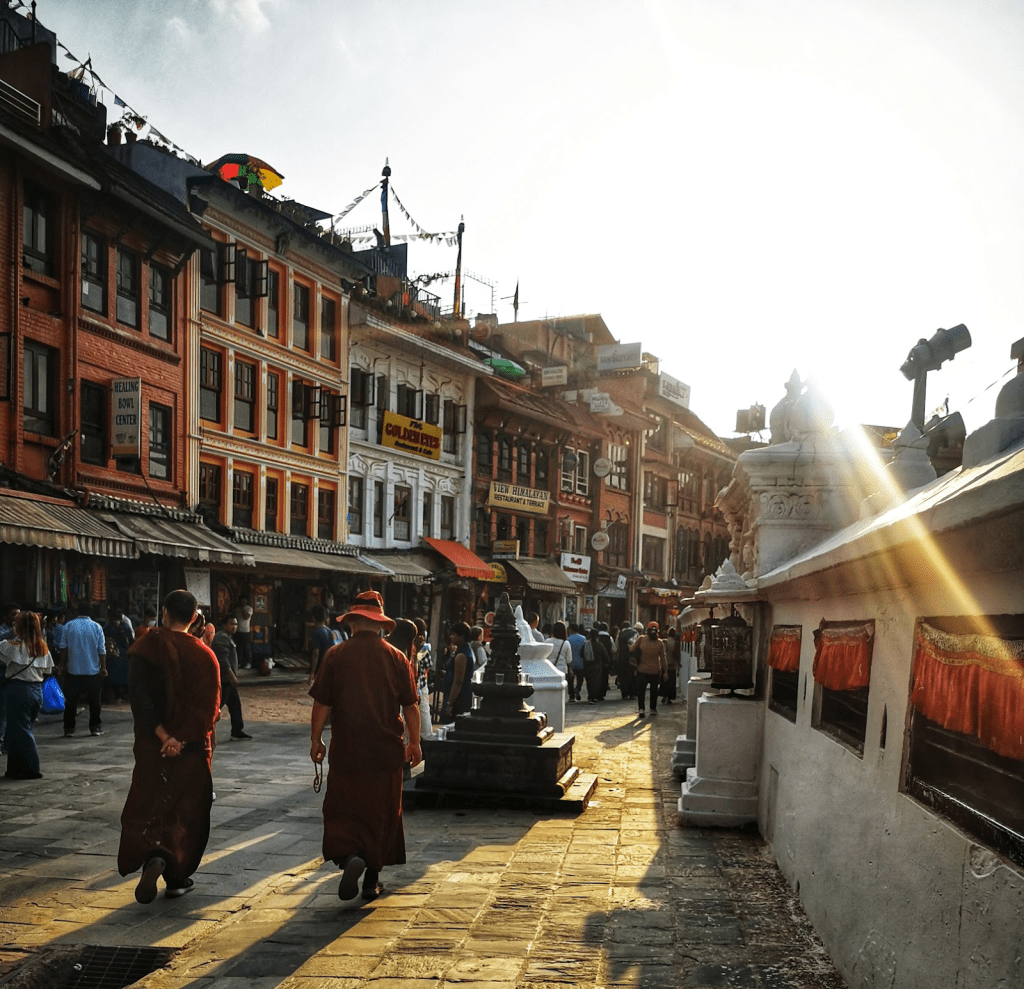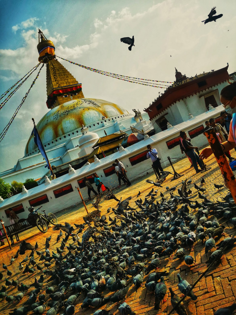 Trở về với lòng thung lũng, bảo tháp Boudhanath hiện ra như một vầng trăng khuyết khổng lồ giữa lòng Kathmandu. Vào lúc hoàng hôn, khi những ngọn đèn bắt đầu được thắp sáng và những dải cờ nguyện tung bay trong gió, Boudhanath trở nên huyền ảo lạ thường. Đôi mắt Phật trên đỉnh tháp, uy nghiêm và bao dung, như đang dõi theo dòng người đi nhiễu quanh tháp theo chiều kim đồng hồ. Tiếng tụng kinh “Om Mani Padme Hum” trầm bổng tạo nên một vòng xoáy năng lượng mạnh mẽ, khiến ta cảm thấy mình như một phần của vòng lặp vô tận của vũ trụ, nơi mỗi bước chân là một sự trở về.