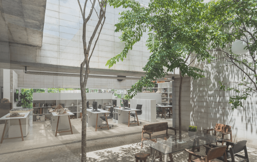 Nếu Vaazh House dùng bê tông để tạo ra những nhát cắt rỗng cho ánh sáng tràn vào, thì KIENTRUC O dưới bàn tay của kiến trúc sư Đàm Vũ lại biến bê tông thành một loại ngôn ngữ kể chuyện về ký ức và sự tĩnh mịch. Trong các công trình của mình, họ thường không sử dụng bê tông một cách ồn ào. Bê tông ở đó hiện lên mịn màng hơn, thanh thoát hơn nhưng vẫn giữ được sự chân thực của vật liệu. Điểm tương đồng giữa Vaazh House và các dự án của KIENTRUC O chính là việc sử dụng những giếng trời và khoảng sân trong để hóa giải sự nặng nề của trọng lực. Họ không lấp đầy diện tích bằng những khối đặc, mà dùng bê tông để đóng khung những khoảng rỗng của bầu trời. Khi bước đi trong những không gian ấy, ta thấy mình được bao bọc bởi sự vững chãi của đất đá nhưng vẫn cảm nhận được nhịp thở nhẹ bẫng của mây trời. Đó là một sự nhún nhường đầy tinh tế để thiên nhiên trở thành chủ thể chính của không gian.